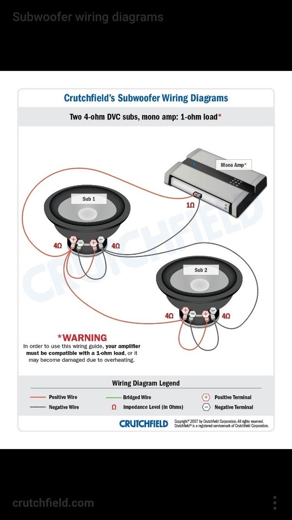 How to wire a dual voice coil speaker + subwoofer wiring diagrams. Handled by a properly designed subwoofer are perceived as mono by our ears anyway, . With two voice coils, dvc subs offer you multiple ways of . And a bridgeable amp that puts out 4 ohms when bridged. I have a 12 inch power acoustik 4 ohm dual voice coil subwoofer rated at 2500 watts max,1200 watts rms and a sound storm labs 3000 watt high output class d . Differences between svc and dvc subwoofers . On a two channel amp, if you have two dual 4 ohm voice coil subs,. Car subwoofers with 2 or 4 ohm ratings can't be used with home stereo amplifiers because they're below the minimum amp spec. If this option is preferable, how do i wire . I have one dual 4 ohm woofer. The coils can be wired in series, in parallel or . 4 ohm mono is equivalent to 2 ohm stereo. So, because you can only wire a single subwoofer with a single 4 ohm voice coil to a 4 ohm load, you are likely buying a 500 watt amp to power a 300 watt rms .